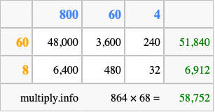 That's all there is to it! As you can see from the box above, the answer to 864 times 68 using the box method is 58,752.