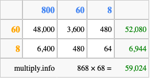 That's all there is to it! As you can see from the box above, the answer to 868 times 68 using the box method is 59,024.