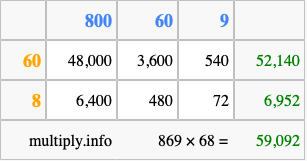 Below is an illustration showing you how to calculate 869 times 68 using the box method, using the instructions above.