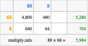 That's all there is to it! As you can see from the box above, the answer to 88 times 68 using the box method is 5,984.