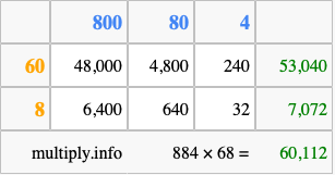 That's all there is to it! As you can see from the box above, the answer to 884 times 68 using the box method is 60,112.