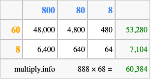 That's all there is to it! As you can see from the box above, the answer to 888 times 68 using the box method is 60,384.