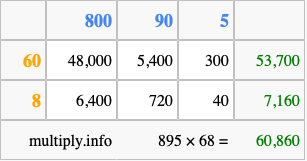 Finally, we add up all the sums we found in step 3 to get our final answer to 895 times 68.