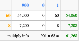 That's all there is to it! As you can see from the box above, the answer to 901 times 68 using the box method is 61,268.