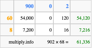 Finally, we add up all the sums we found in step 3 to get our final answer to 902 times 68.