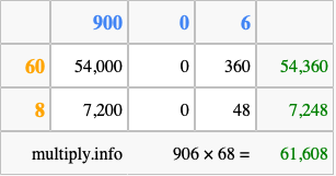 Finally, we add up all the sums we found in step 3 to get our final answer to 906 times 68.