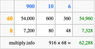 That's all there is to it! As you can see from the box above, the answer to 916 times 68 using the box method is 62,288.