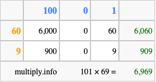 Below is an illustration showing you how to calculate 101 times 69 using the box method, using the instructions above.