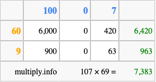 Below is an illustration showing you how to calculate 107 times 69 using the box method, using the instructions above.