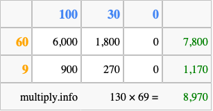 Below is an illustration showing you how to calculate 130 times 69 using the box method, using the instructions above.