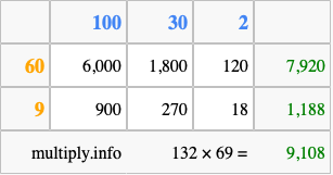 Finally, we add up all the sums we found in step 3 to get our final answer to 132 times 69.