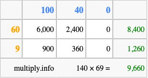 Below is an illustration showing you how to calculate 140 times 69 using the box method, using the instructions above.