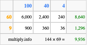 Finally, we add up all the sums we found in step 3 to get our final answer to 144 times 69.