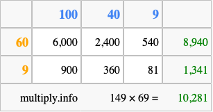 Below is an illustration showing you how to calculate 149 times 69 using the box method, using the instructions above.