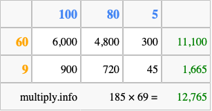 Finally, we add up all the sums we found in step 3 to get our final answer to 185 times 69.