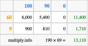 Below is an illustration showing you how to calculate 190 times 69 using the box method, using the instructions above.