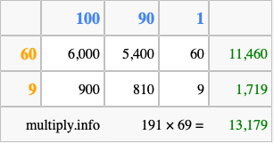 That's all there is to it! As you can see from the box above, the answer to 191 times 69 using the box method is 13,179.