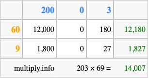 Below is an illustration showing you how to calculate 203 times 69 using the box method, using the instructions above.