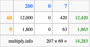 That's all there is to it! As you can see from the box above, the answer to 207 times 69 using the box method is 14,283.
