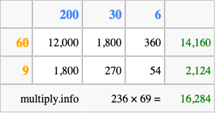 Finally, we add up all the sums we found in step 3 to get our final answer to 236 times 69.