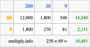 Finally, we add up all the sums we found in step 3 to get our final answer to 239 times 69.