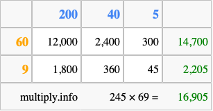 Finally, we add up all the sums we found in step 3 to get our final answer to 245 times 69.