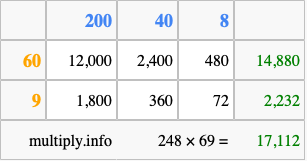 Finally, we add up all the sums we found in step 3 to get our final answer to 248 times 69.