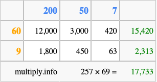 Below is an illustration showing you how to calculate 257 times 69 using the box method, using the instructions above.