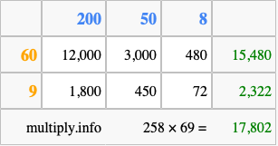 Below is an illustration showing you how to calculate 258 times 69 using the box method, using the instructions above.