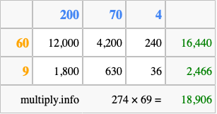 Finally, we add up all the sums we found in step 3 to get our final answer to 274 times 69.