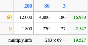 That's all there is to it! As you can see from the box above, the answer to 283 times 69 using the box method is 19,527.