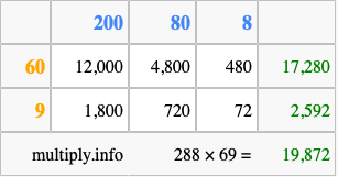That's all there is to it! As you can see from the box above, the answer to 288 times 69 using the box method is 19,872.