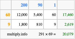 Below is an illustration showing you how to calculate 291 times 69 using the box method, using the instructions above.