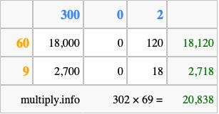 That's all there is to it! As you can see from the box above, the answer to 302 times 69 using the box method is 20,838.