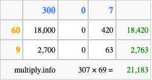 Below is an illustration showing you how to calculate 307 times 69 using the box method, using the instructions above.