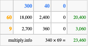 Finally, we add up all the sums we found in step 3 to get our final answer to 340 times 69.
