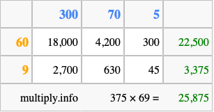 Finally, we add up all the sums we found in step 3 to get our final answer to 375 times 69.