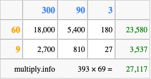 Below is an illustration showing you how to calculate 393 times 69 using the box method, using the instructions above.