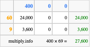 That's all there is to it! As you can see from the box above, the answer to 400 times 69 using the box method is 27,600.