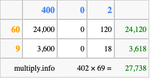 That's all there is to it! As you can see from the box above, the answer to 402 times 69 using the box method is 27,738.