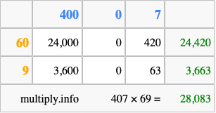 Finally, we add up all the sums we found in step 3 to get our final answer to 407 times 69.