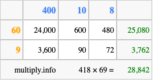 Finally, we add up all the sums we found in step 3 to get our final answer to 418 times 69.