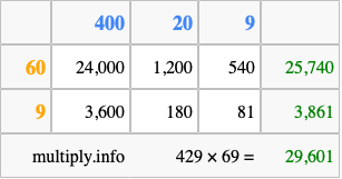 Below is an illustration showing you how to calculate 429 times 69 using the box method, using the instructions above.