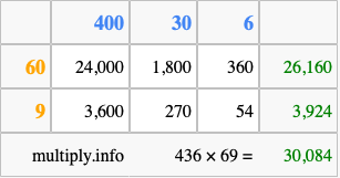 Finally, we add up all the sums we found in step 3 to get our final answer to 436 times 69.