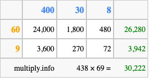 That's all there is to it! As you can see from the box above, the answer to 438 times 69 using the box method is 30,222.