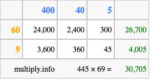 Finally, we add up all the sums we found in step 3 to get our final answer to 445 times 69.
