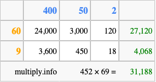 Finally, we add up all the sums we found in step 3 to get our final answer to 452 times 69.
