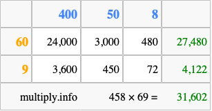 Finally, we add up all the sums we found in step 3 to get our final answer to 458 times 69.