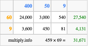 Finally, we add up all the sums we found in step 3 to get our final answer to 459 times 69.
