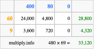 Finally, we add up all the sums we found in step 3 to get our final answer to 480 times 69.